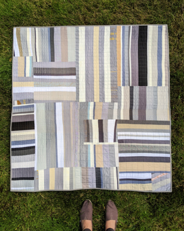 So the quilt top that was pieced and hanging on my design wall when I got distracted and made Sidetrack is finally finished. Begun as a gray 'scrappy strings' quilt, it evolved a bit to include black and white and tan, as well as just a few subtle gold-laced prints towards the end. I actually thought of making the gold even more visible, but at some point let that idea go.