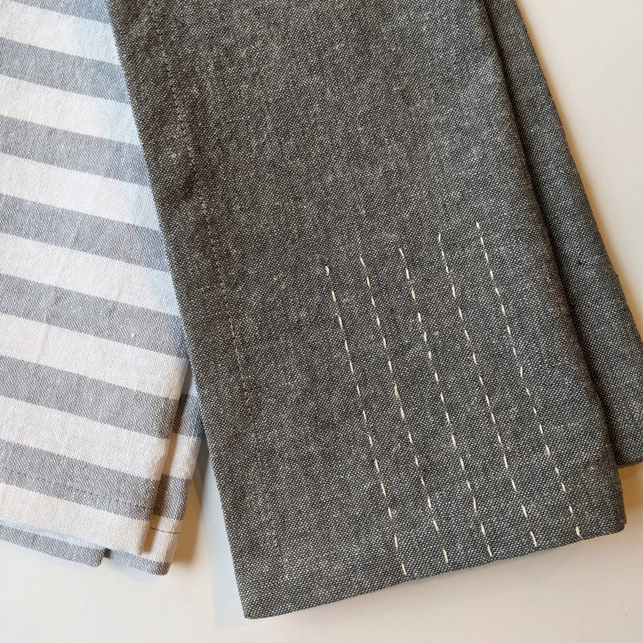And from there, the towels sewed up like a dream. Though I thought the stripes could stand on their own, I echoed them by hand-stitching on the plain gray using perle cotton. At 15" x 25", the towels are a nice size - not too big, not too small. You know now I really want to make some for myself!