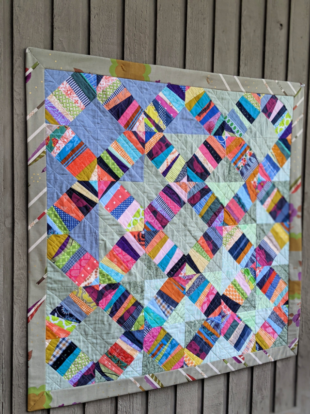 Boy were folks interested About those House Top Blocks. A simple log cabin variation, the resultant quilt really did use up a ton of scraps. I enjoyed mixing various substrates into this project too.