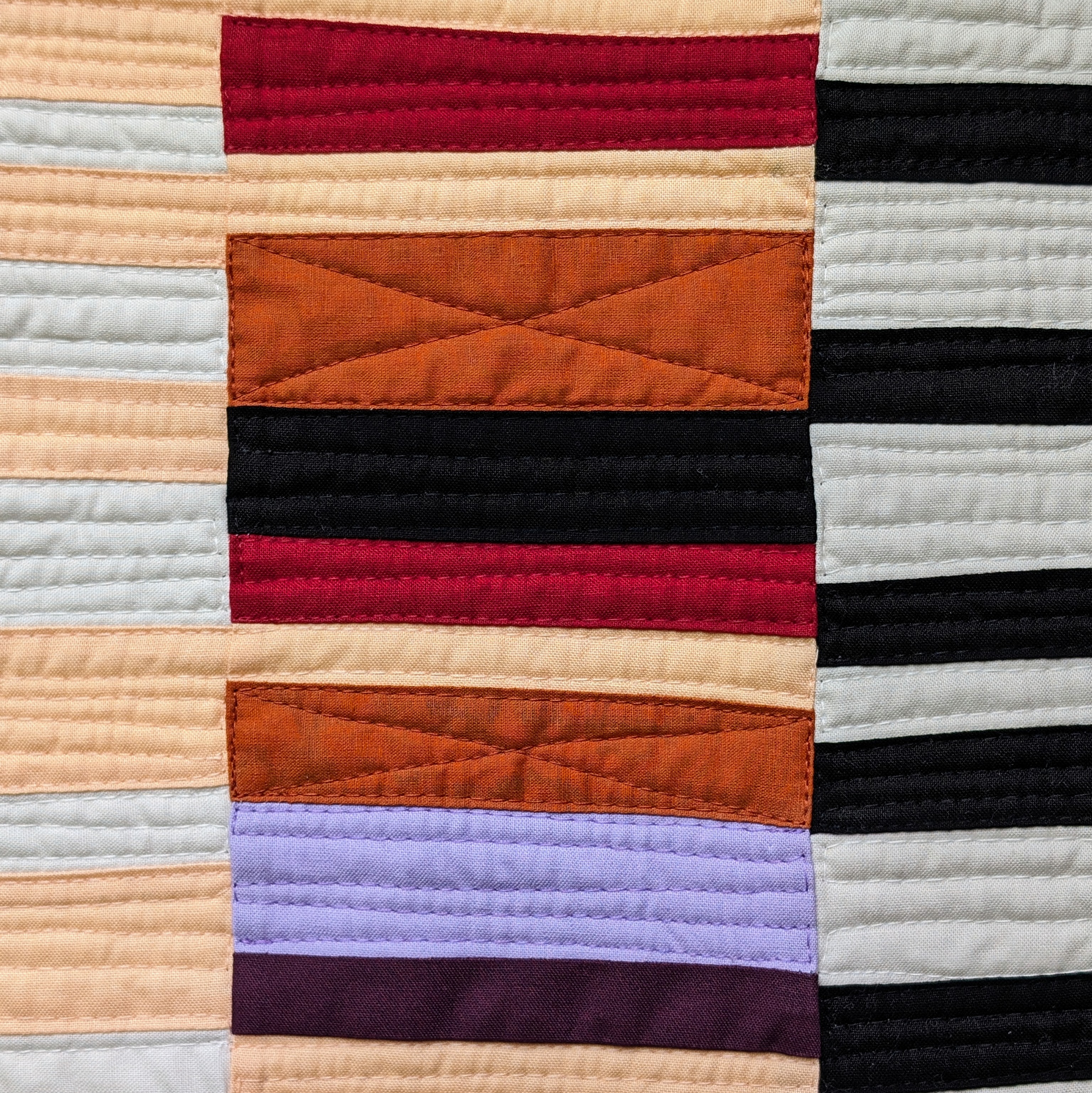 Early on, I had a bit of inspiration about a relatively simple design involving improv stripes, and once I had my Pantone swatch card in hand, I worked on an initial fabric pull - Konas Black, White, Ruby, Orchid Ice, Raisin, Terracotta, and RJR Apricot Ice, plus as I began piecing, what I think was Kona Cedar. This time around, the Pantone Peach Fuzz color is more of a team-player than the key focus, but it's what felt fun to play with this time around.